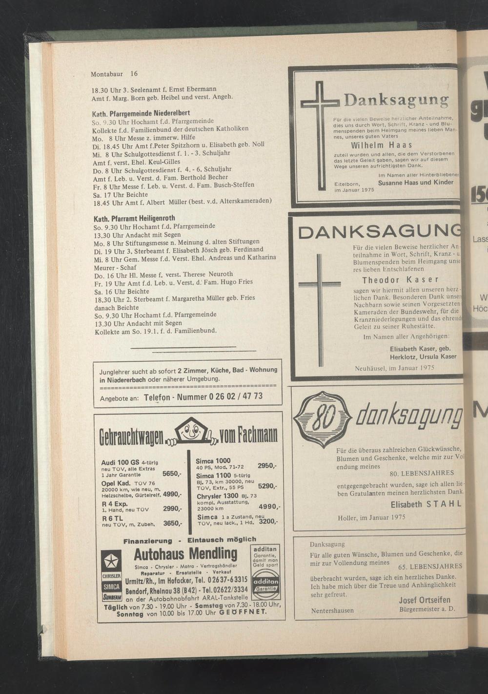 Do. 16 Uhr Hl. Messe f. verst. Therese Neuroth Fr. 19 Uhr Amt f.d. Leb. u. Verst. d; Farn. Hugo Fries Sa. 16 Uhr Beichte