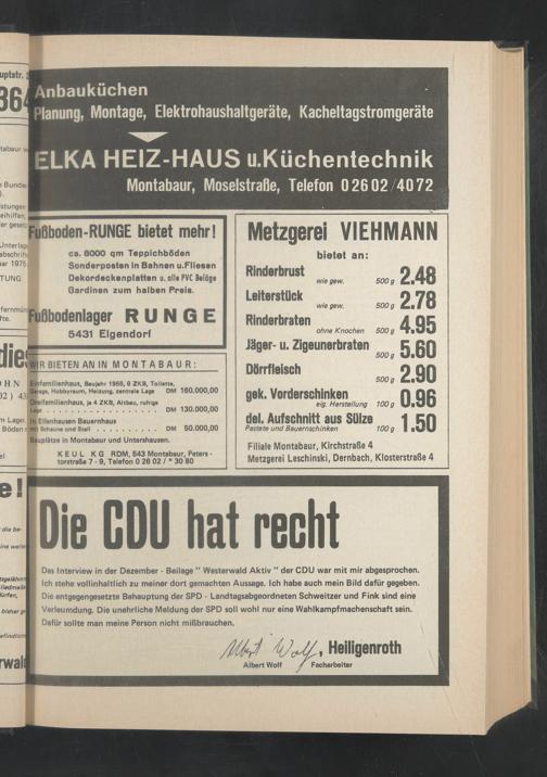 Das Interview in der Dezember - Beilage" Westerwald Aktiv " der CDU war mit mir abgesprochen. Ich stehe vollinhaltlich zu meiner dort gemachten Aussage. Ich habe auch mein Bild dafür gegeben. Die entgegengesetzte Behauptung der SPD • Landtagsabgeordneten Schweitzer und Fink sind eine Verleumdung. Die unehrliche Meldung der SPD soll wohl nur eine Wahlkampfmachenschaft sein. Dafür sollte man meine Person nicht mißbrauchen.