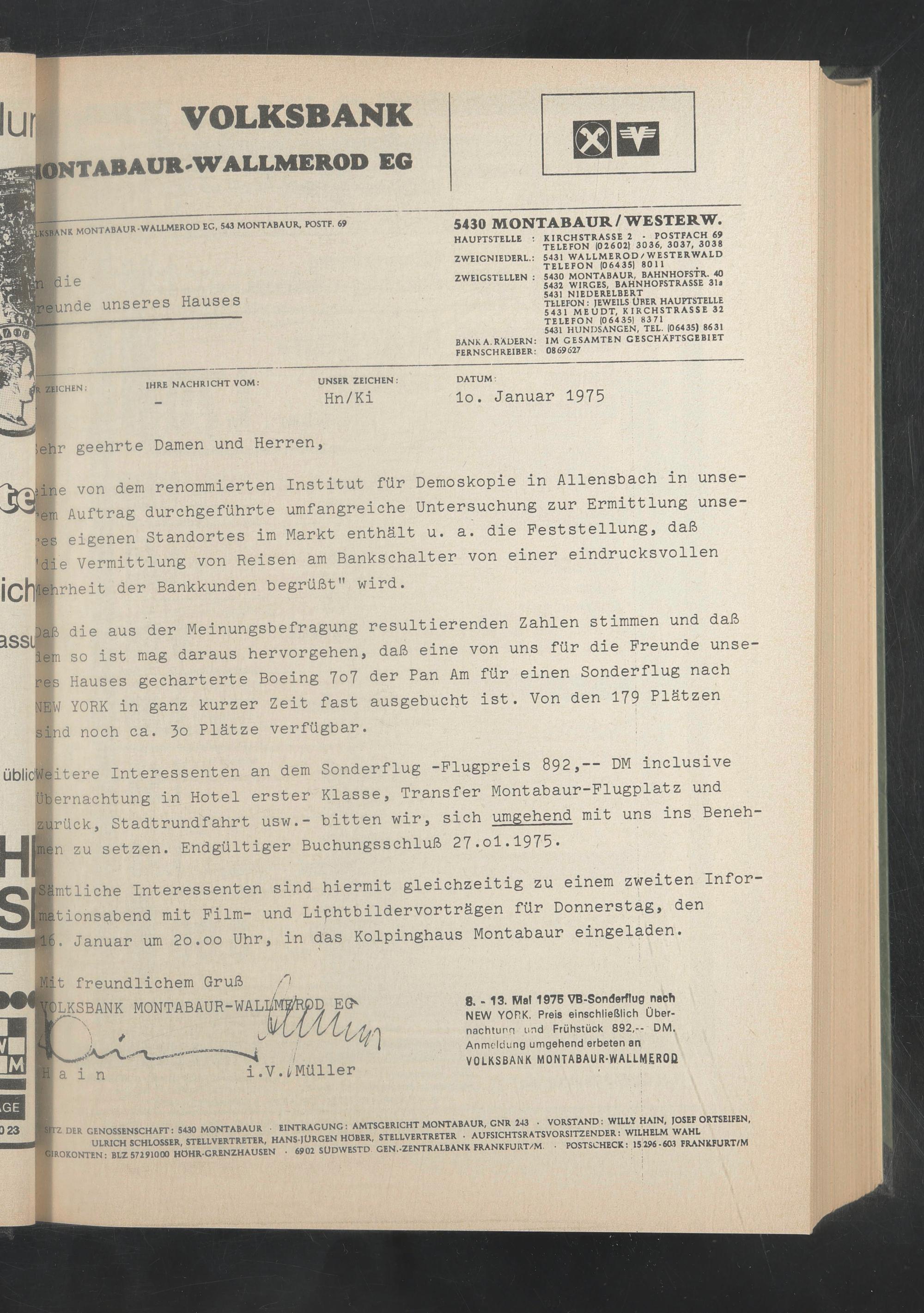 üblicITeitere Interessenten an dem Sonderflug -Flugpreis 892,-- DM inclusive Übernachtung in Hotel erster Klasse, Transfer Montabaur-Flugplatz und :urück, Stadtrundfahrt usw.- bitten wir, sich umgehend mit uns ins Beneh zu setzen. Endgültiger Buchungsschluß 27.ol. 1975