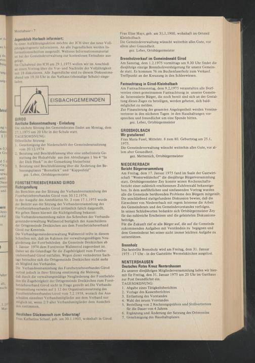 Die nächste Sitzung des Gemeinderates findet am Montag, dem 27.1.1975 um 20 Uhr in der Schule statt.