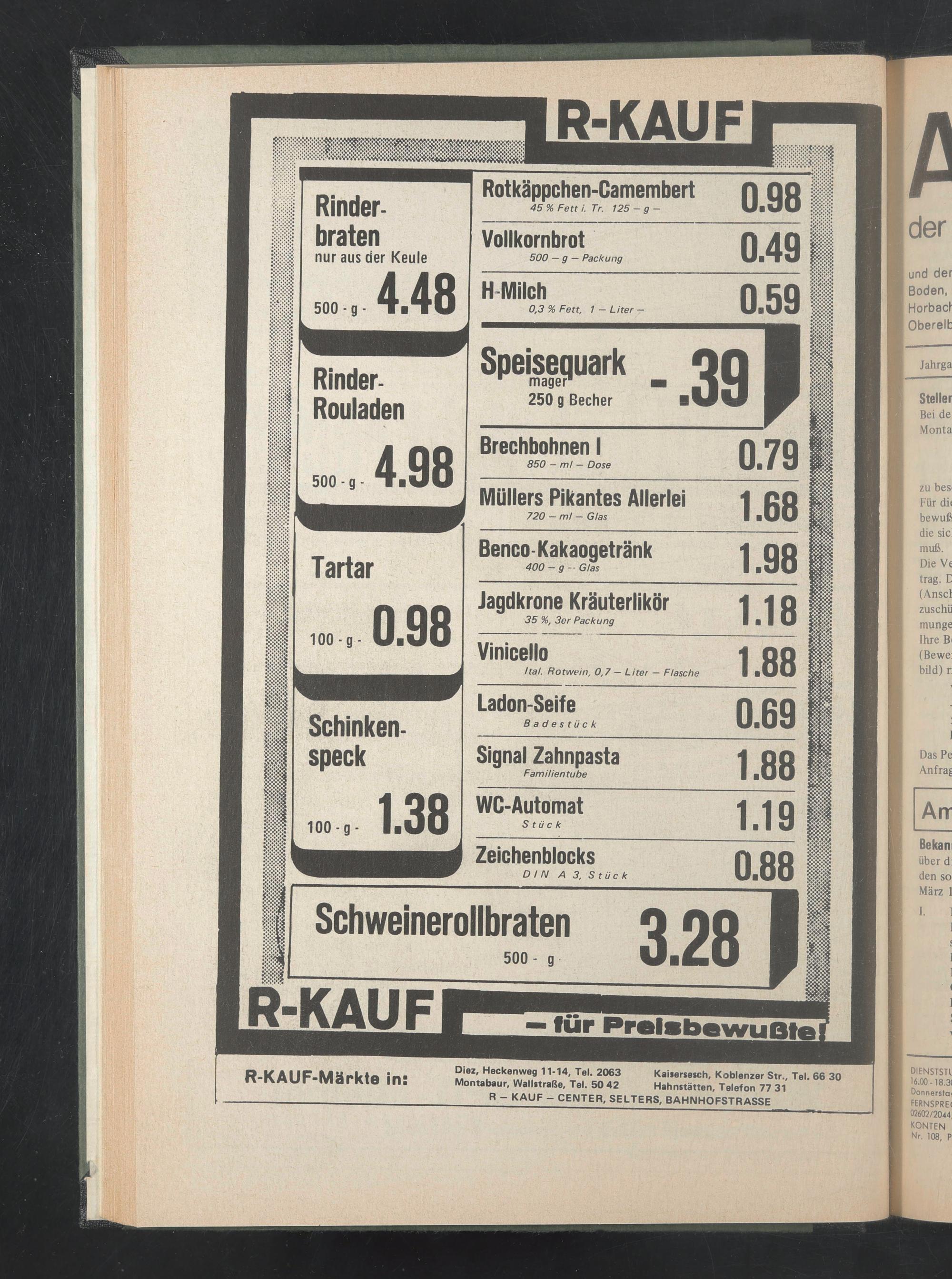 Diez, Heckenweg 11-14, Tel. 2063 Kaisersesch, Koblenzer Str., Tel. 66 30 Montabaur, Wallstraße, Tel. 50 42 Hahnstätten, Telefon 77 31 _ R - KAUF - CENTER, SELTERS, BAHNHOFSTRASSE