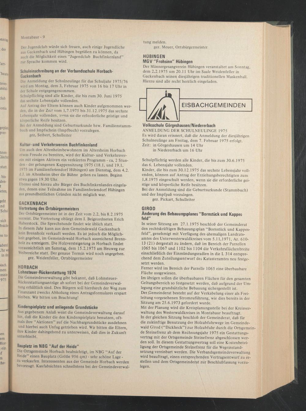 In diesem Jahr kann aus dem Gemeindewald Gackenbach kein Brennholz verkauft werden. Es ist jedoch die Möglichkeit gegeben, im Gemeindewald Horbach ausreichend Brennholz zu ersteigern. Die Holzversteigerung in Horbach findet voraussichtlich am Samstag, dem 15.2.1975 am Heuweg zur Weibereiche statt. Der genaue Termin wird noch angegeben, gez. Weidenfeller, Ortsbürgermeister