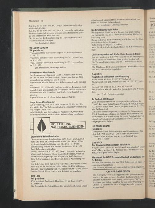 Zum erstenmal erreichten die angemeldeten Bürger die “300”. Der neue Erdenbürger, Wolfgang Köhn, Kißbergstr, I 12, machte durch seine Geburt, ausgerechnet am 1.1.1975 f die Zahl rundvoll.
