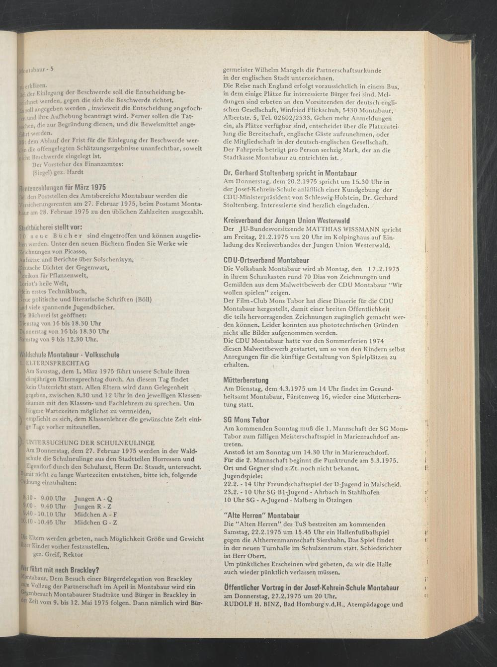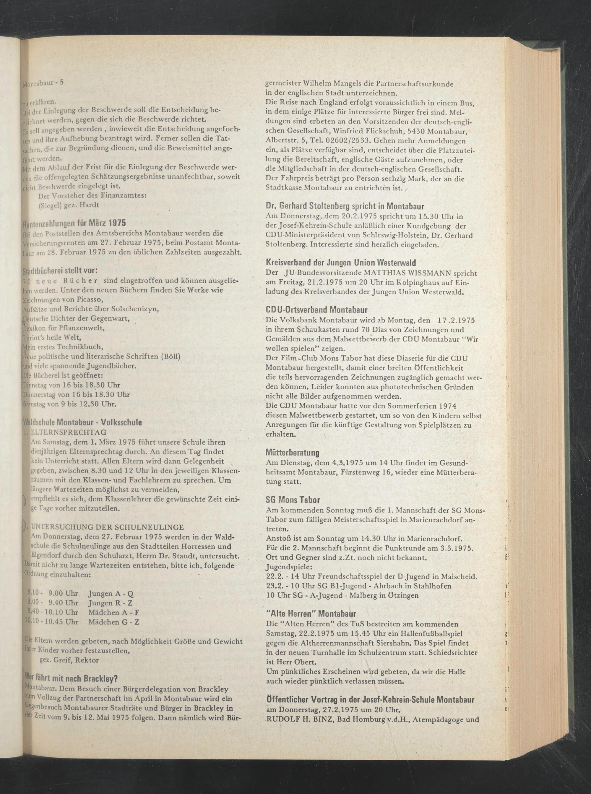 Montabaur. Dem Besuch einer Bürgerdelegation von Brackley 1 Vollzug der Partnerschaft im April in Montabaur wird ein lfgenbesuch Montabaurer Stadträte und Bürger in Brackley in Her Zeit vom 9. bis 12. Mai 1975 folgen. Dann nämlich wird Bür