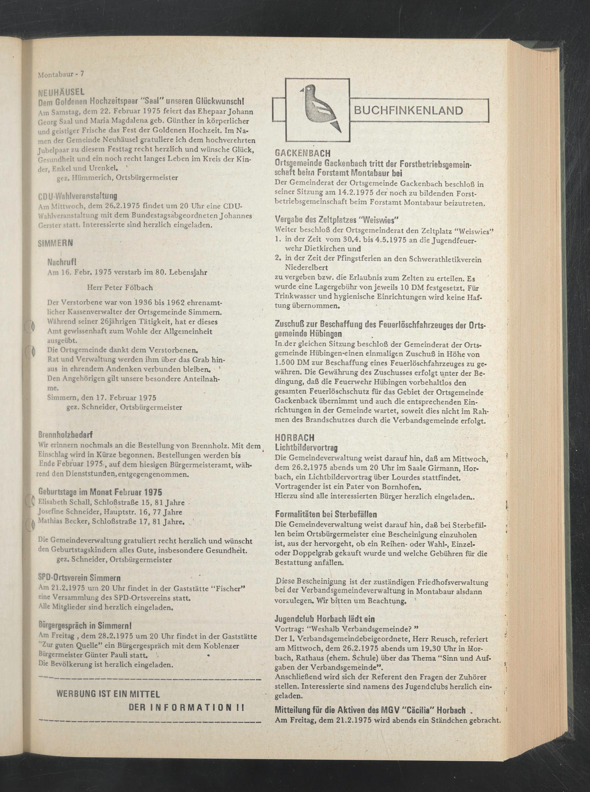 Der I. Verbandsgemeindebeigeordnete, Herr Reusch, referiert am Mittwoch, dem 26.2.1975 abends um 19.30 Uhr in Horbach, Rathaus (ehern. Schule) über das Thema "Sinn und Aufgaben der Verbandsgemeinde”.