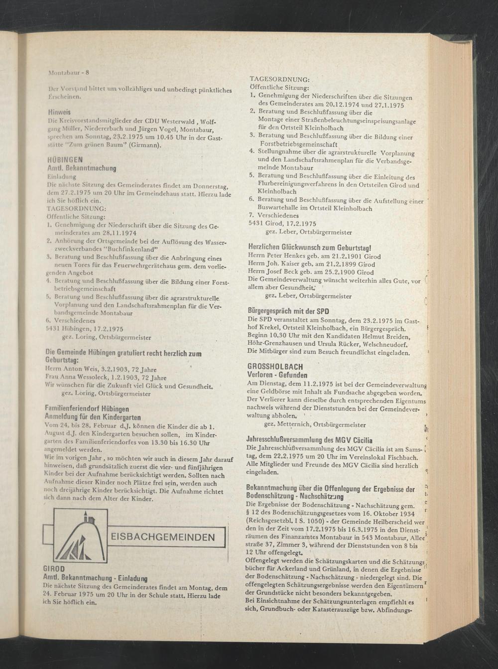 Die nächste Sitzung des Gemeinderates findet am Donnerstag, dem 27.2.1975 um 20 Uhr im Gemeindehaus statt. Hierzu lade ich Sie höflich ein.