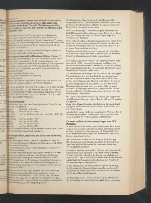 In einer kurzen Feierstunde, zu der das Deutsche Rote Kreuz und die Nassauische Sparkasse Montabaur gemeinsam eingeladen hatten, konnte am Samstag, dem 22. Februar 1975 ein neuer Krankentransportwagen dem Kreisverband des Roten Kreuzes übergeben werden.