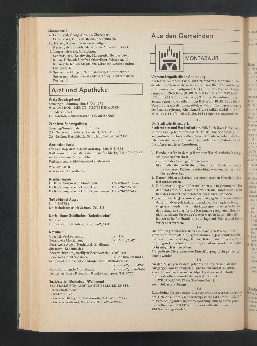 von Samstag, dem 8.3. bis Samstag, dem 15.3.1975 Rathaus-Apotheke, Montabaur, Großer Markt, Tel. o26o2/5o61 mittwochs von 13 bis 18 Uhr Rathaus- und Schloß-Apotheke, Montabaur