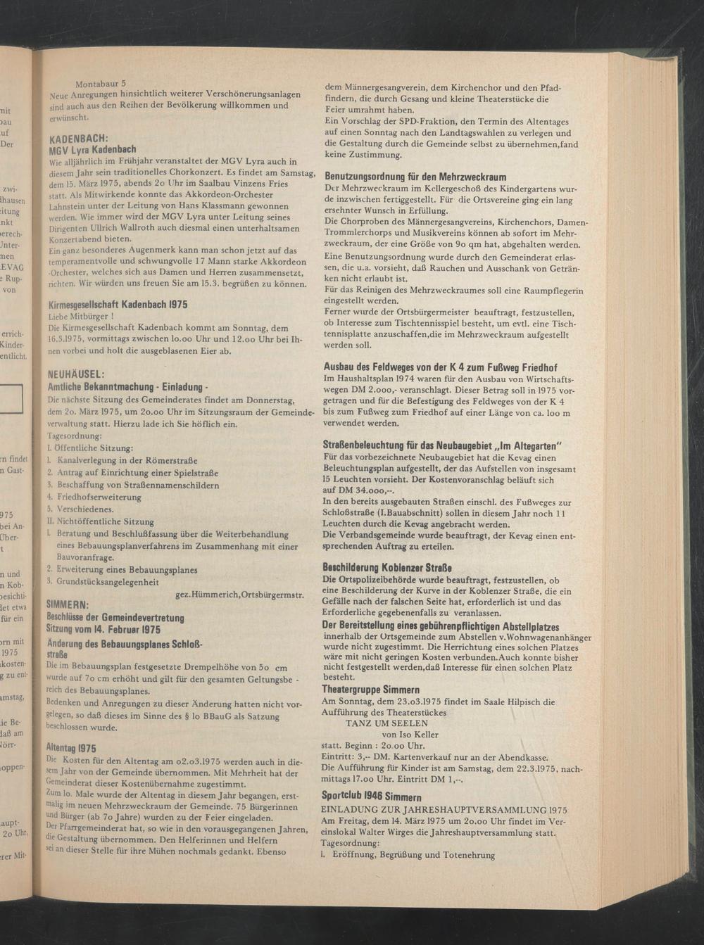 Die nächste Sitzung des Gemeinderates findet am Donnerstag, dem 2o. März 1975, um 2o.oo Uhr im Sitzungsraum der Gemeindeverwaltung statt. Hierzu lade ich Sie höflich ein.