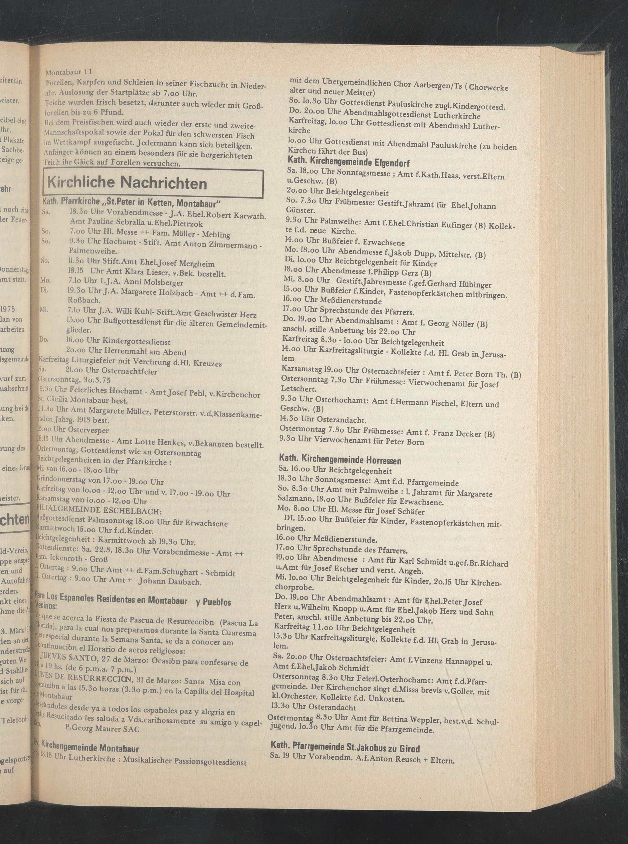 Karsamstag 19.oo Uhr Ostemachtsfeier : Amt f. Peter Born Th. (B) Ostersonntag 7.3o Uhr Frühmesse: Vierwochenamt für Josef Letschert.