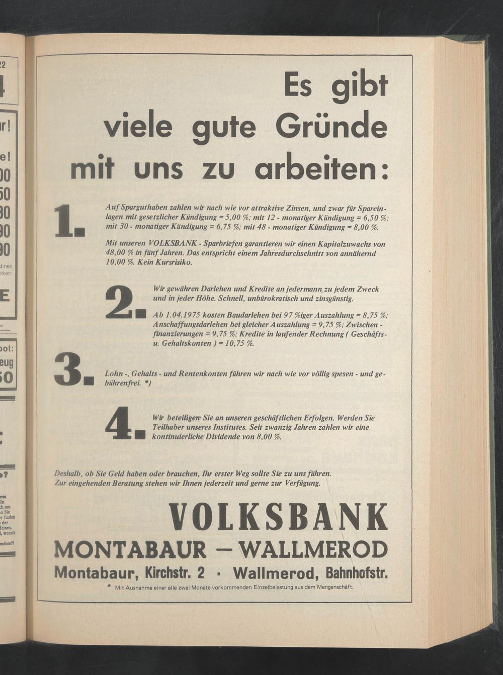 ■ Ab 1.04.1975 kosten Baudarlehen bei 97 %iger Auszahlung = 8,75 %; Anschaffungsdarlehen bei gleicher Auszahlung = 9,75 %; Zwischen - finanzierungen = 9,75 %; Kredite in laufender Rechnung ( Geschäfts- u. Gehaltskonten ) = 10,75 %.