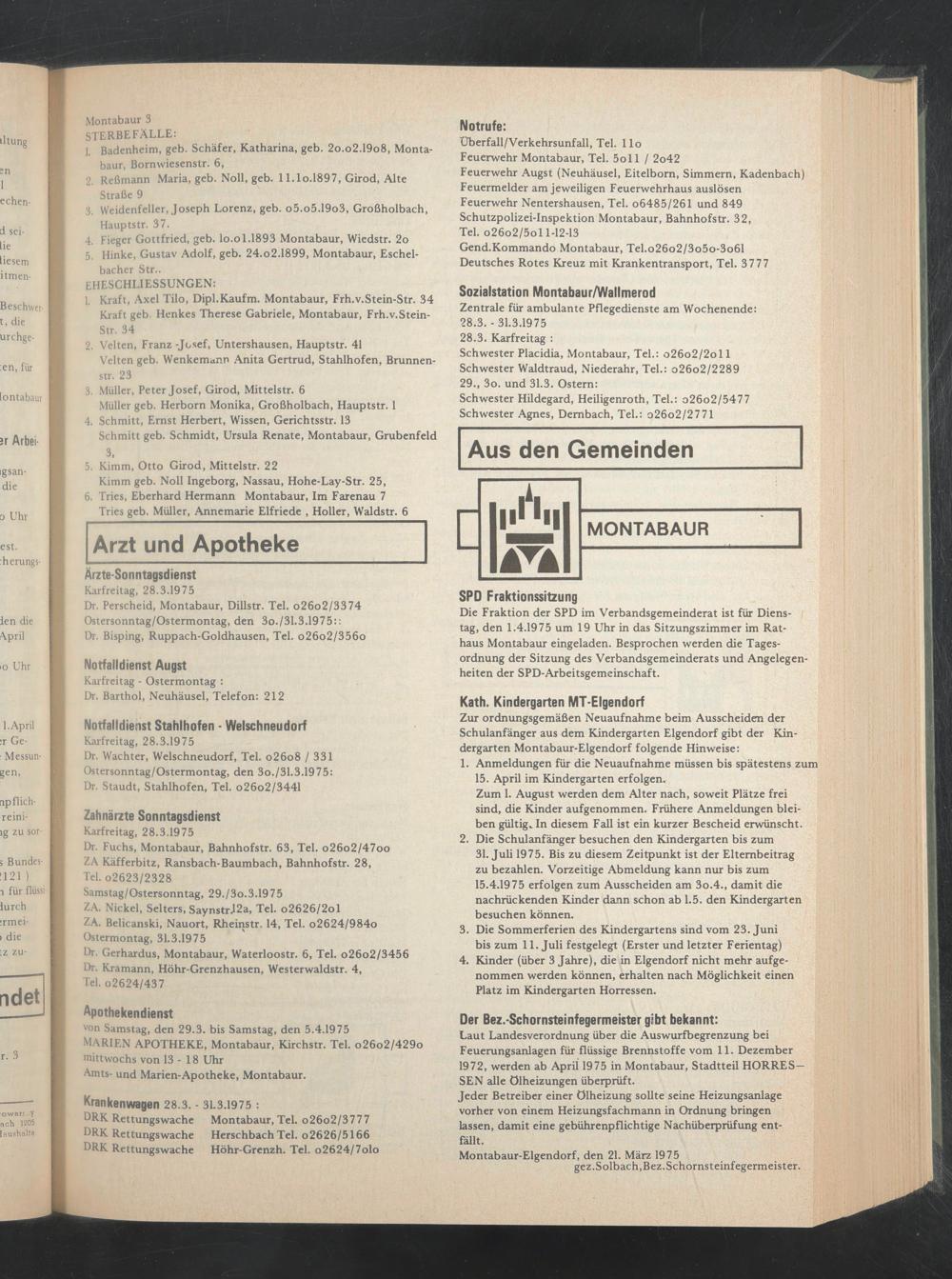 Die Fraktion der SPD im Verbandsgemeinderat ist für Dienstag, den 1.4.1975 um 19 Uhr in das Sitzungszimmer im Rathaus Montabaur eingeladen. Besprochen werden die Tagesordnung der Sitzung des Verbandsgemeinderats und Angelegenheiten der SPD-Arbeitsgemeinschaft.