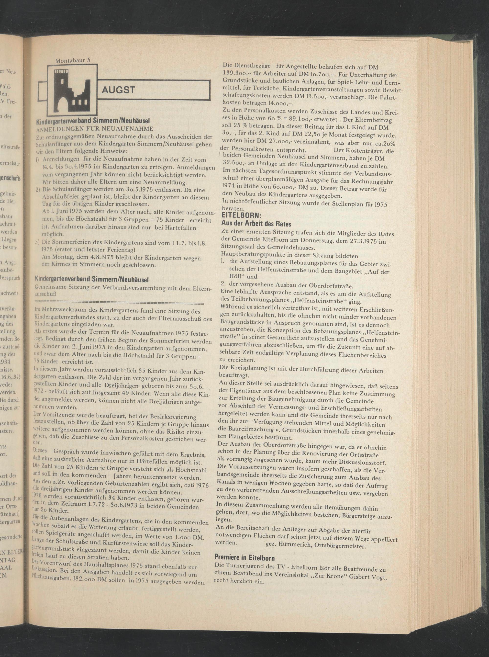 beiden Gemeinden Neuhäusel und Simmern, haben je DM 32.5oo,- an Umlage an den Kindergartenverband zu zahlen.