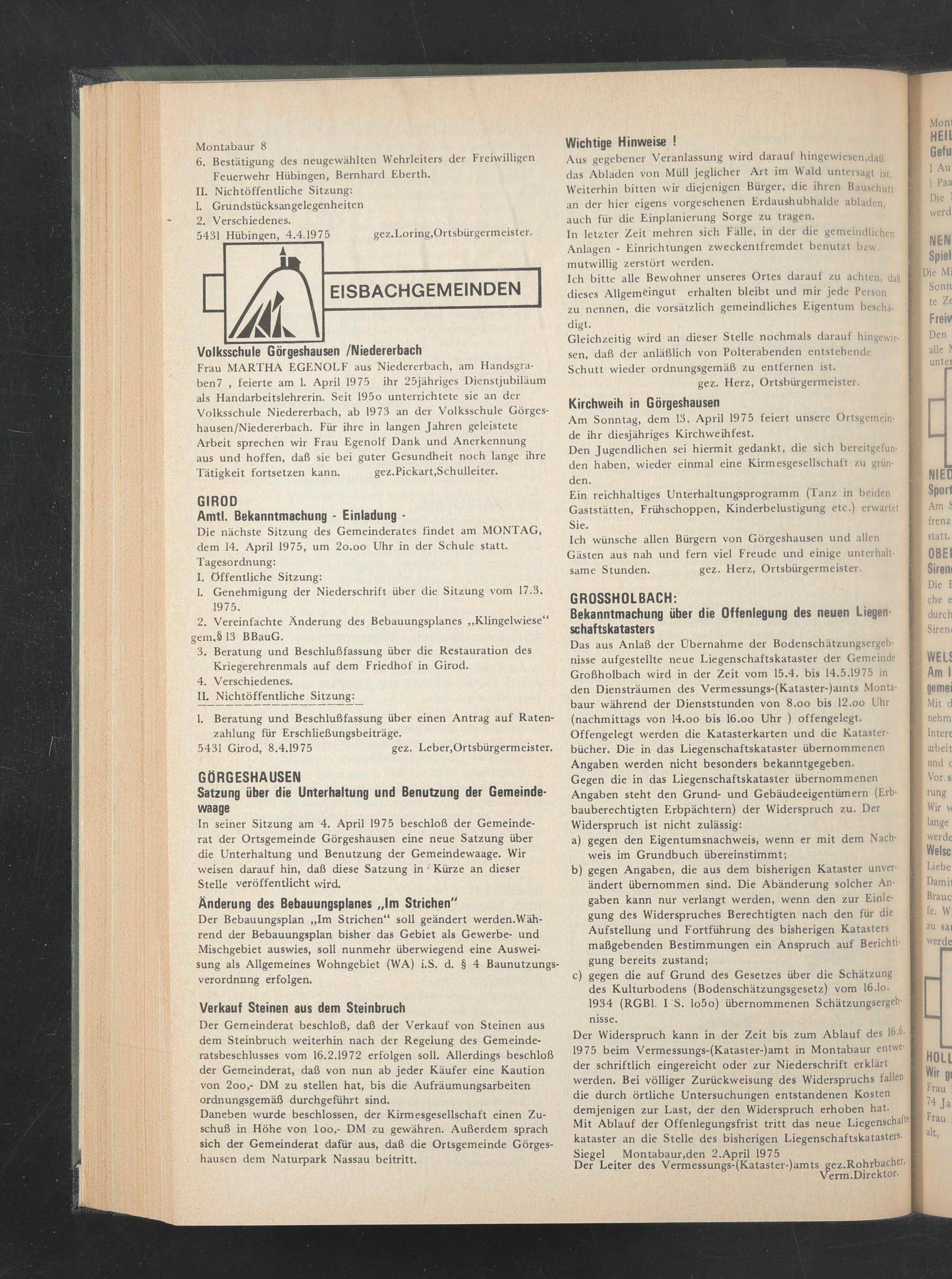 5431 Hübingen, 4.4.1975 gez.Loring,Ortsbürgermeister.