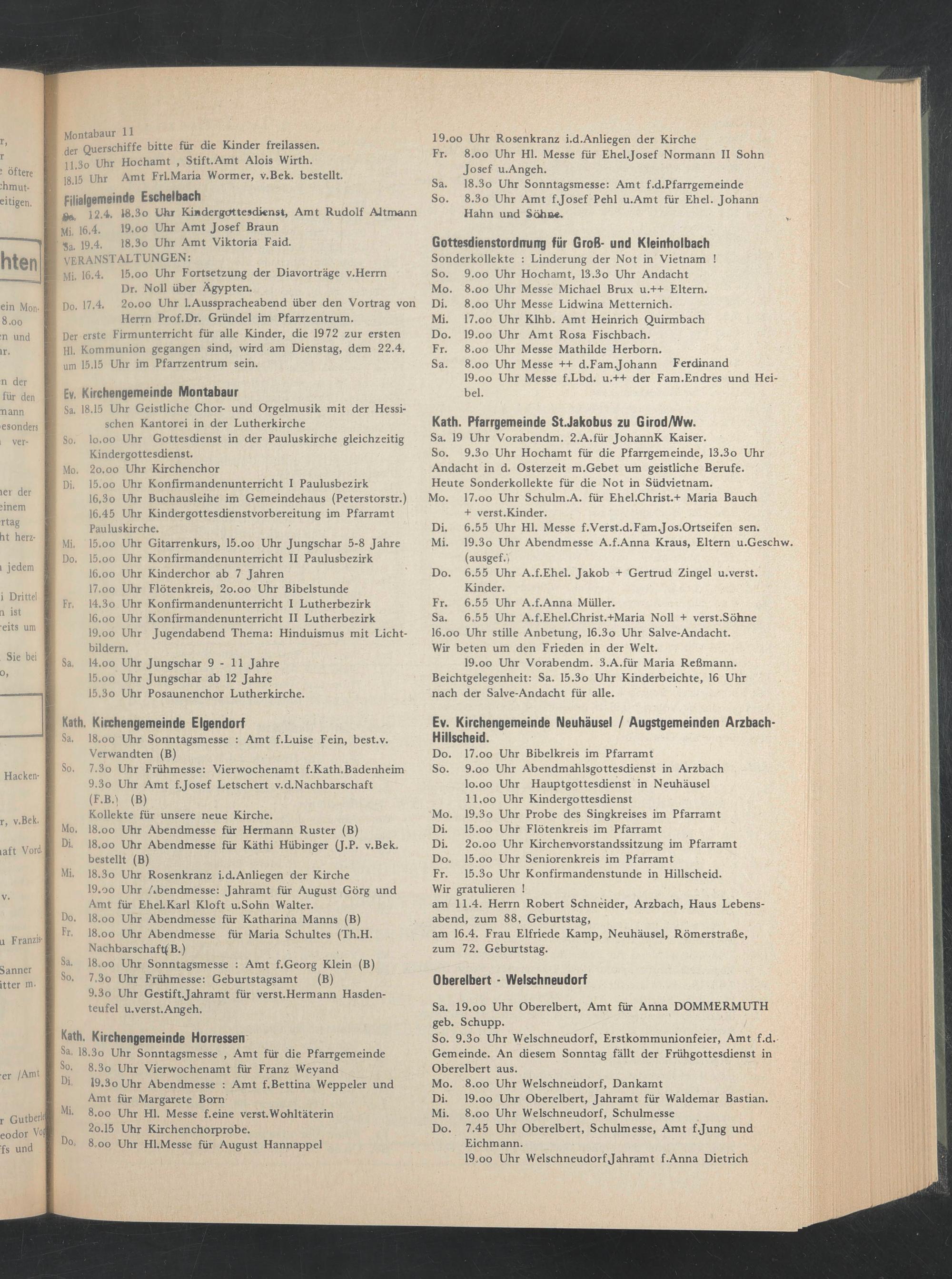Mi. 8.oo Uhr Welschneudorf, Schulmesse Do. 7.45 Uhr Oberelbert, Schulmesse, Amt f.Jung und Eichmann.