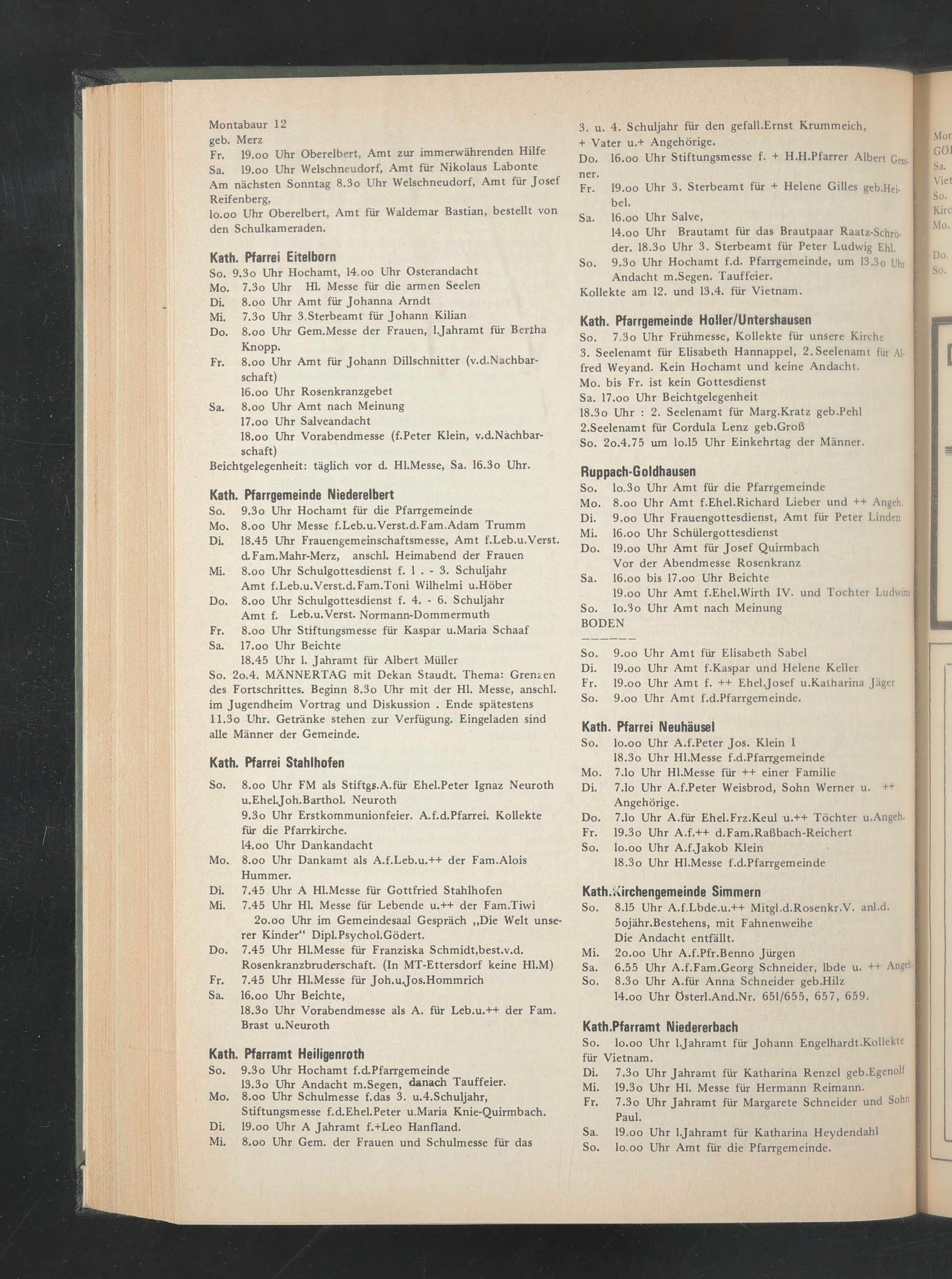 Fr. 19.oo Uhr Oberelbert, Amt zur immerwährenden Hilfe Sa. 19.00 Uhr Welschneudorf, Amt für Nikolaus Labonte Am nächsten Sonntag 8.3o Uhr Welschneudorf, Amt für Josef Reifenberg,