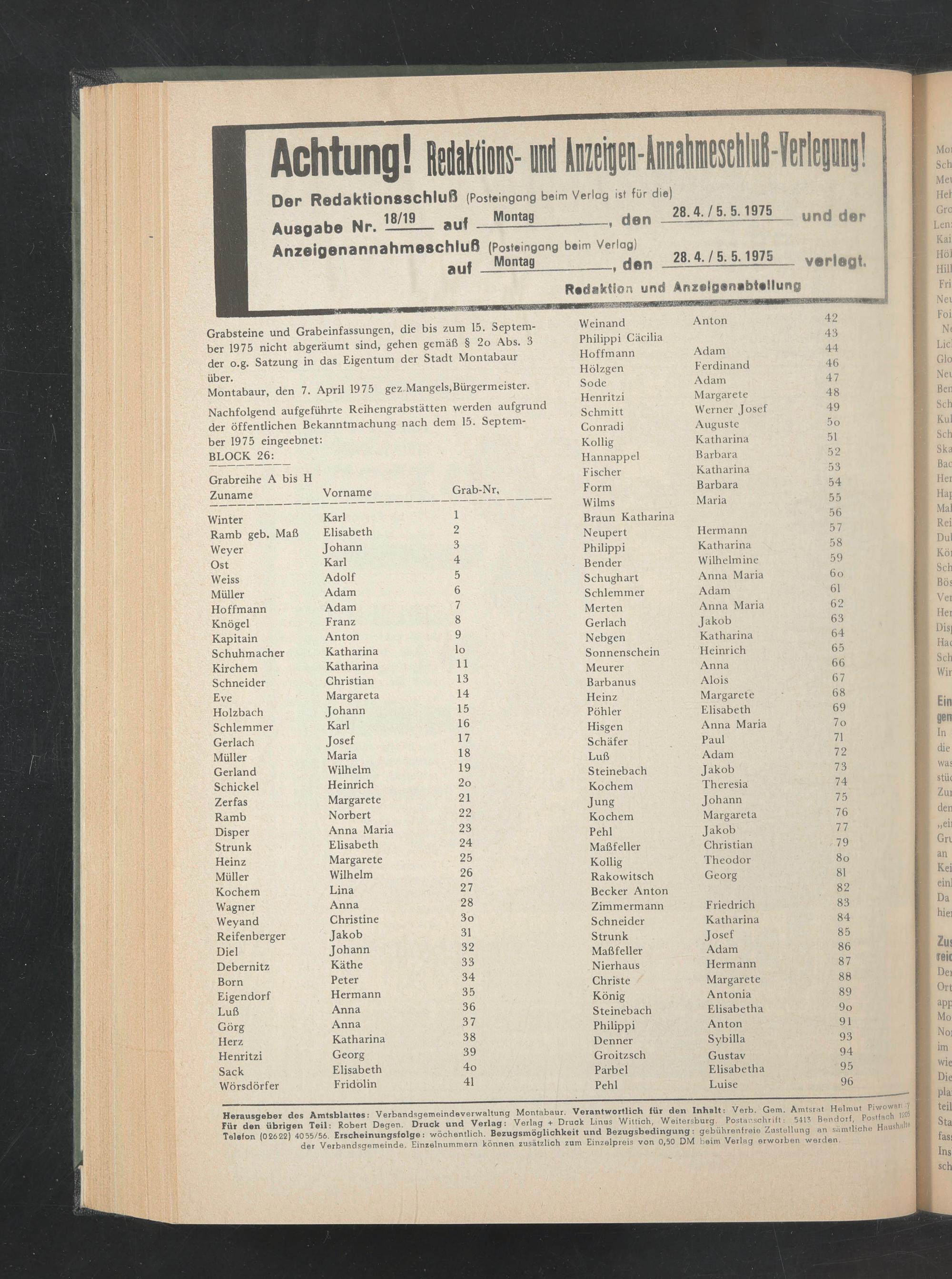 Herausgeber des Amtsblattes: Verbandsgemeindeverwaltung Montabaur. Verantwortlich lür den Inhalt: Verb. Gern. Amtsrat Helmut Piwowar;^ Für den übrigen Teil: Robert Degen. Druck und Verlag: Verlag + Druck Linus Wiltich, Weitersburg. Postanschrift: 541? Bendorf, Postfach 1/ Telefon (02622) 4055/56. Erscheinungsfolge: wöchentlich. Bezugsmöglichkeit und Bezugsbedingung: gebührenfreie Zustellung an sämtliche Haushalt® der Verbandsgemeinde. Einzelnummern können zusätzlich zum Einzelpreis von 0,50 DM beim Verlag erworben werden.