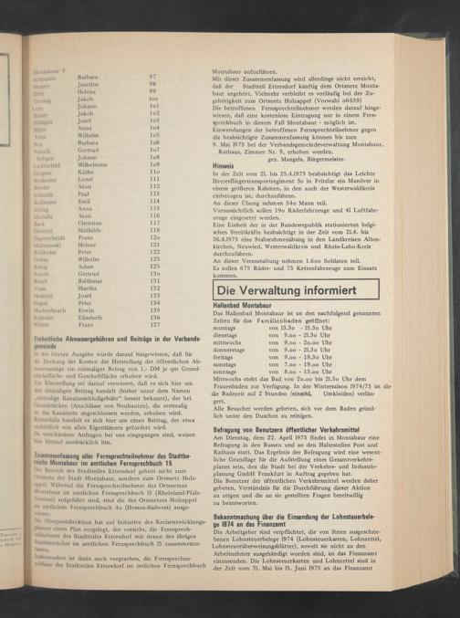 Die betroffenen Fernsprechteilnehmer werden darauf hingewiesen, daß eine kostenlose Eintragung nur in einem Fernsprechbuch in diesem Fall Montabaur - möglich ist. Einwendungen der betroffenen Fernsprechteilnehmer gegen die beabsichtigte Zusammenfassung können bis zum 9. Mai 1975 bei der Verbandsgemeindeverwaltung Montabaur, Rathaus, Zimmer Nr. 9, erhoben werden.