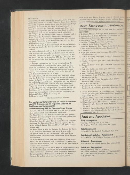 Personenstandsmeldungen für die Zeit vom 8.4. bis 14.4.75 GEBURTEN: