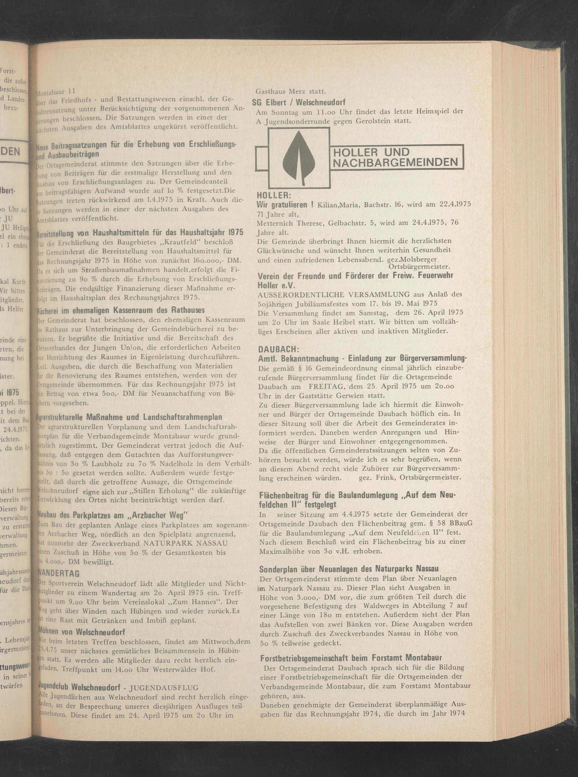 Die gemäß § 16 Gemeindeordnung einmal jährlich einzuberufende Bürgerversammlung findet für die Ortsgemeinde Daubach am FREITAG, dem 25 April 1975 um 2o.oo Uhr in der Gaststätte Gerwien statt.