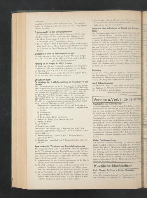 Der Ortsbürgermeister hat in der Sitzung des Gemeinderates der Ortsgemeinde Untershausen am 13.3.1975 nach Anhörung der nicht wegen Sonderinteresse ausgeschlossenen Ratsmitglieder anstelle des Gemeinderates gern. § 39 Abs. 2 der Gemeindeordnung entschieden, daß die Erschließungsanlagen im Baugebiet ,,In der Gelbitze“ einschl. der Erweiterung „Im jungen Beul“ im Laufe dieses Jahres fertigzustellen sind. Mit der Bauleitung für die Straßenbauarbeiten wurde das Bauamt der Verbandsgemeindeverwaltune Montabaur beauftragt. Folgende Maßnahmen sind vorgesehen: