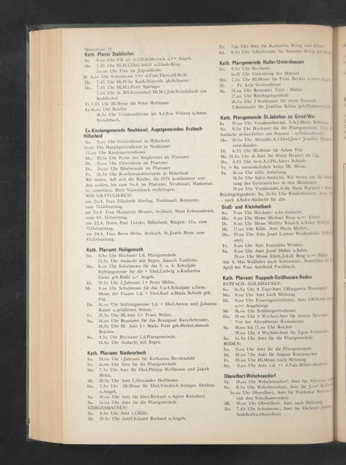 Mo 7.45 Uhr Hl.M.f.Ehel.Adolf u.Elisab.Klug 2o.oo Uhr Film im Jugendheim Di 8.oo Uhr Schulmesse f.++ d.Fam.Thewald-Weiß Mi. 7.45 Uhr Hl.M für Kath.Neuroth, gb.Schuster Do. 7.45 Uhr Hi.M.f.Peter Sprenger