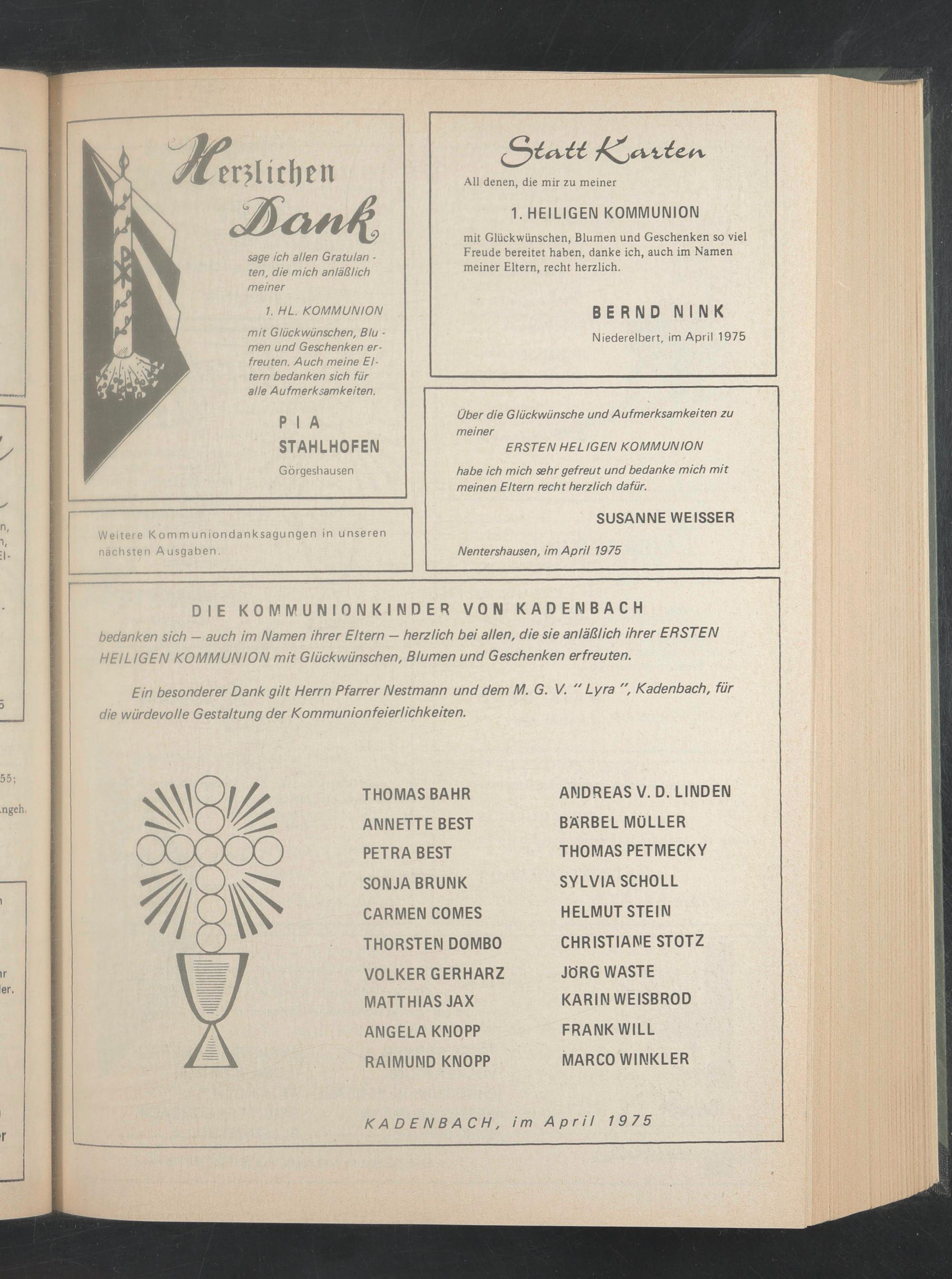 Ein besonderer Dank gilt Herrn Pfarrer Nestmann und dem M. G. V. " Lyra ", Kadenbach, für die würdevolle Gestaltung der Kommunion feierlichkeiten.