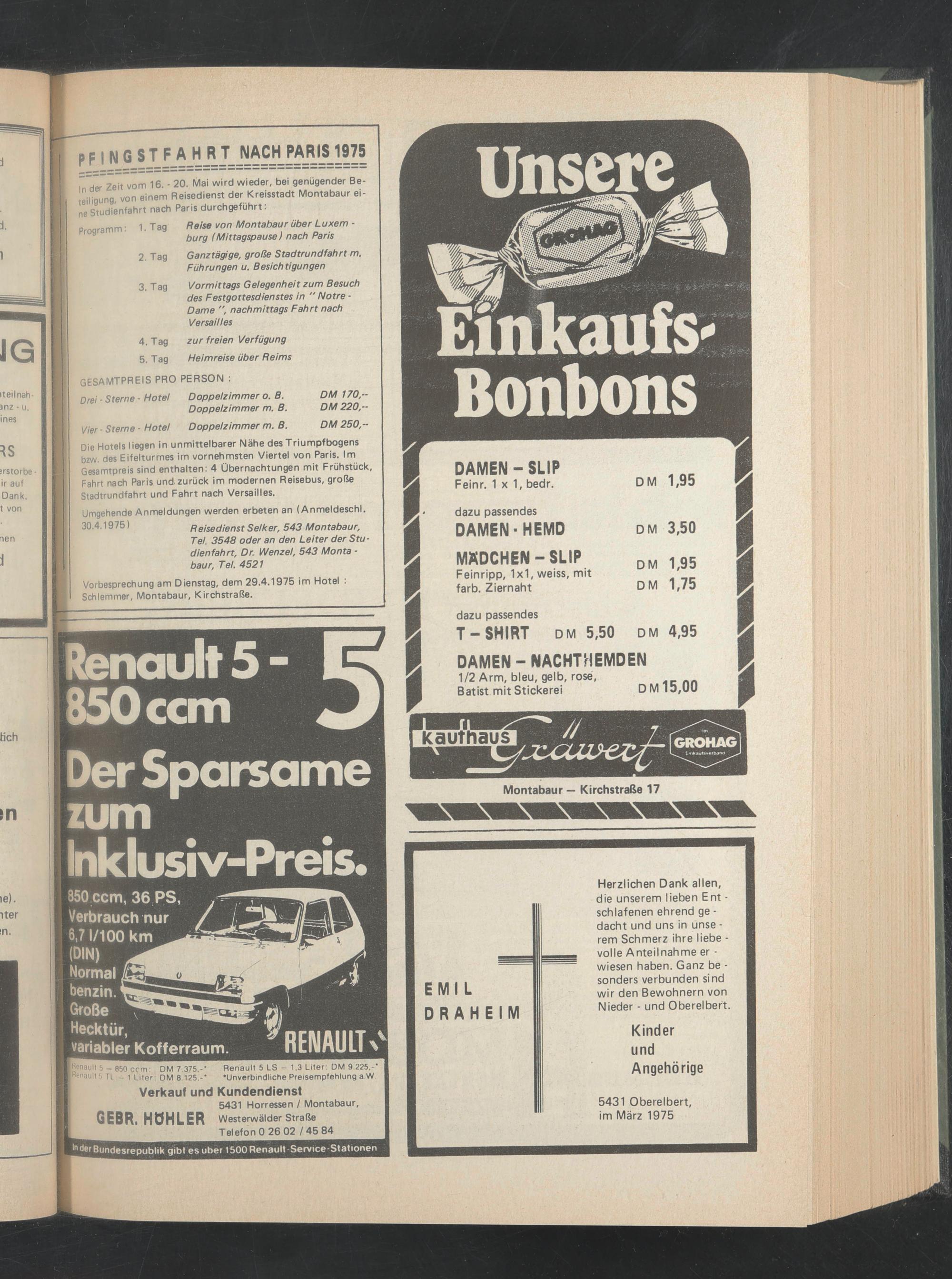 ln der Zeit vom 16. - 20. Mai wird wieder, bei genügender Beteiligung, von einem Reisedienet der Kreisstadt Montabaur eine Studienfahrt nach Paris durchgeführt :