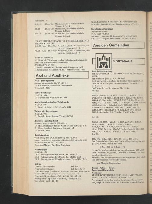 von Samstag dem 26.4. bis Samstag den 3.5.1975 Marien - Apotheke, Montabaur, Kirchstr., Tel. o26o2 / 4290 mittwochs von 13.oo - 18.oo Uhr Amts- und Marien - Apotheke Montabuar