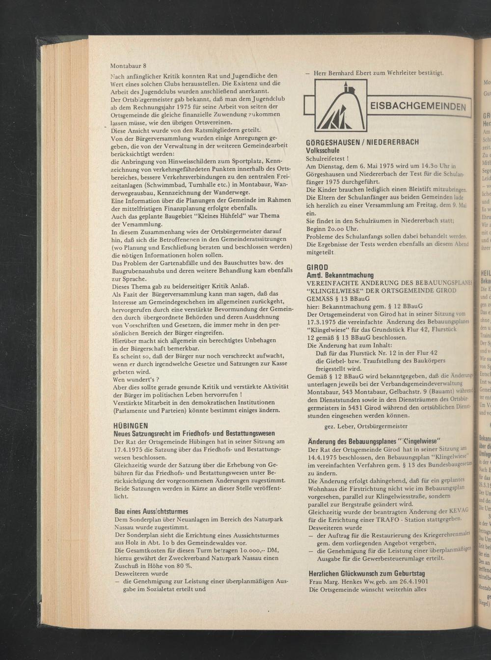 Gemäß § 12 BBauG wird bekanntgegeben, daß die Änderung* unterlagen jeweüs bei der Verbandsgemeindeverwaltung Montabaur, 543 Montabaur, Gelbachstr. 9 (Bauamt) während den Dienststunden sowie in den Diensträumen des Ortsbürgermeisters in 5431 Girod während den ortsüblichen Dienststunden eingesehen werden können.