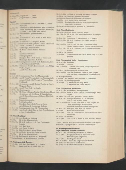 Mi. 18.3o Uhr Rosenkranz i.d. Anliegen d. Kirche 19.oo Uhr Abendmesse: Gestift. Jahramt f. Ehel. Adam Nink Do. 9 oo Uhr Amt f. Luise Fein u. Tochter Maria I8.00 Uhr Eröffnung d. Maiandachten Fr. 8.oo Uhr Hl. Messe f. Ehel. Mathias Ballmann (B.)