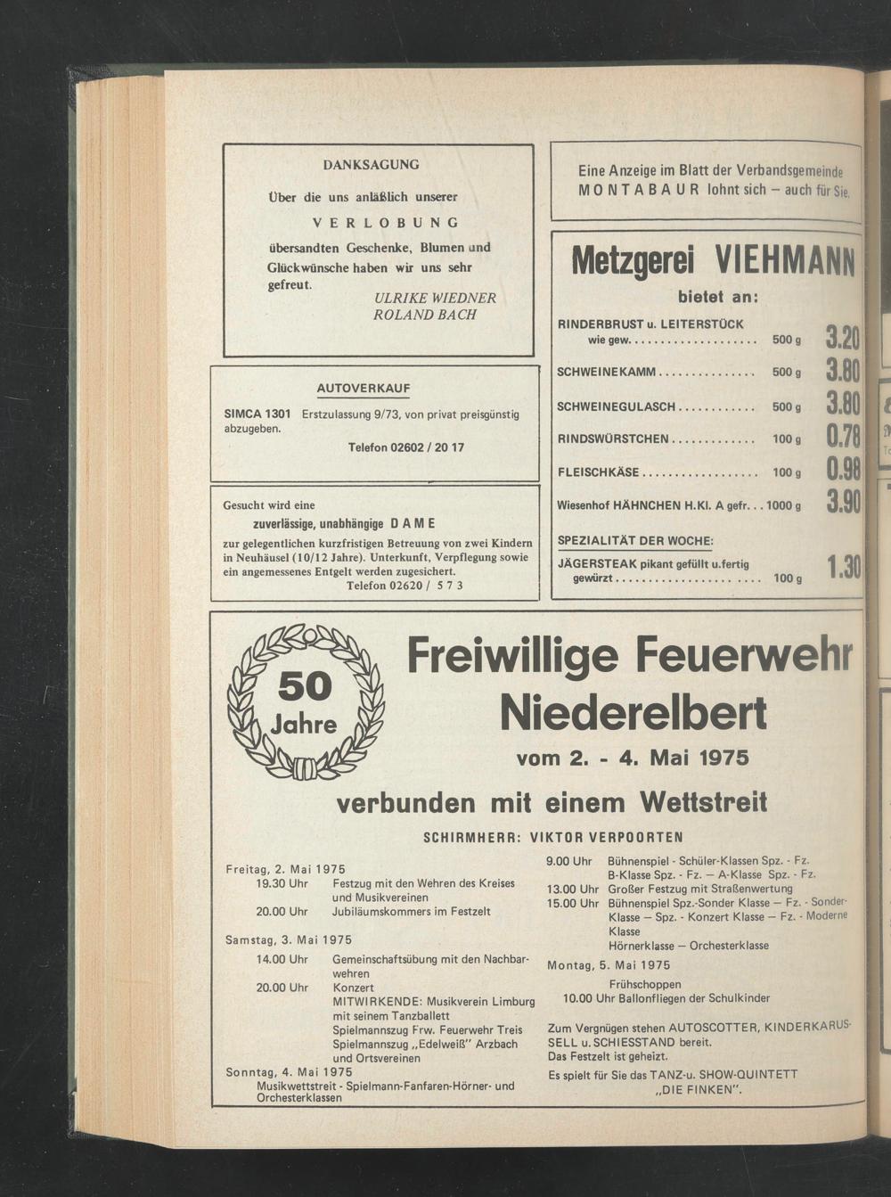 MITWIRKENDE: Musikverein Limburg mit seinem Tanzballett Spielmannszug Frw. Feuerwehr Treis Spielmannszug „Edelweiß" Arzbach und Ortsvereinen Sonntag, 4. Mai 1975