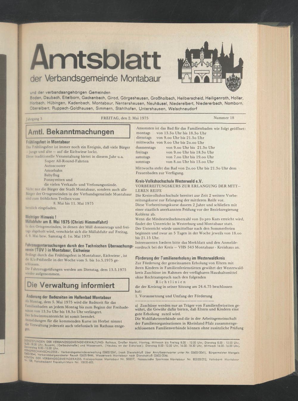Bedingt durch das Frühlingsfest in Montabaur, Eichwiese , ist die Kfz-Prüfstelle in der Woche vom 5. bis lo.5.1975 geschlossen.