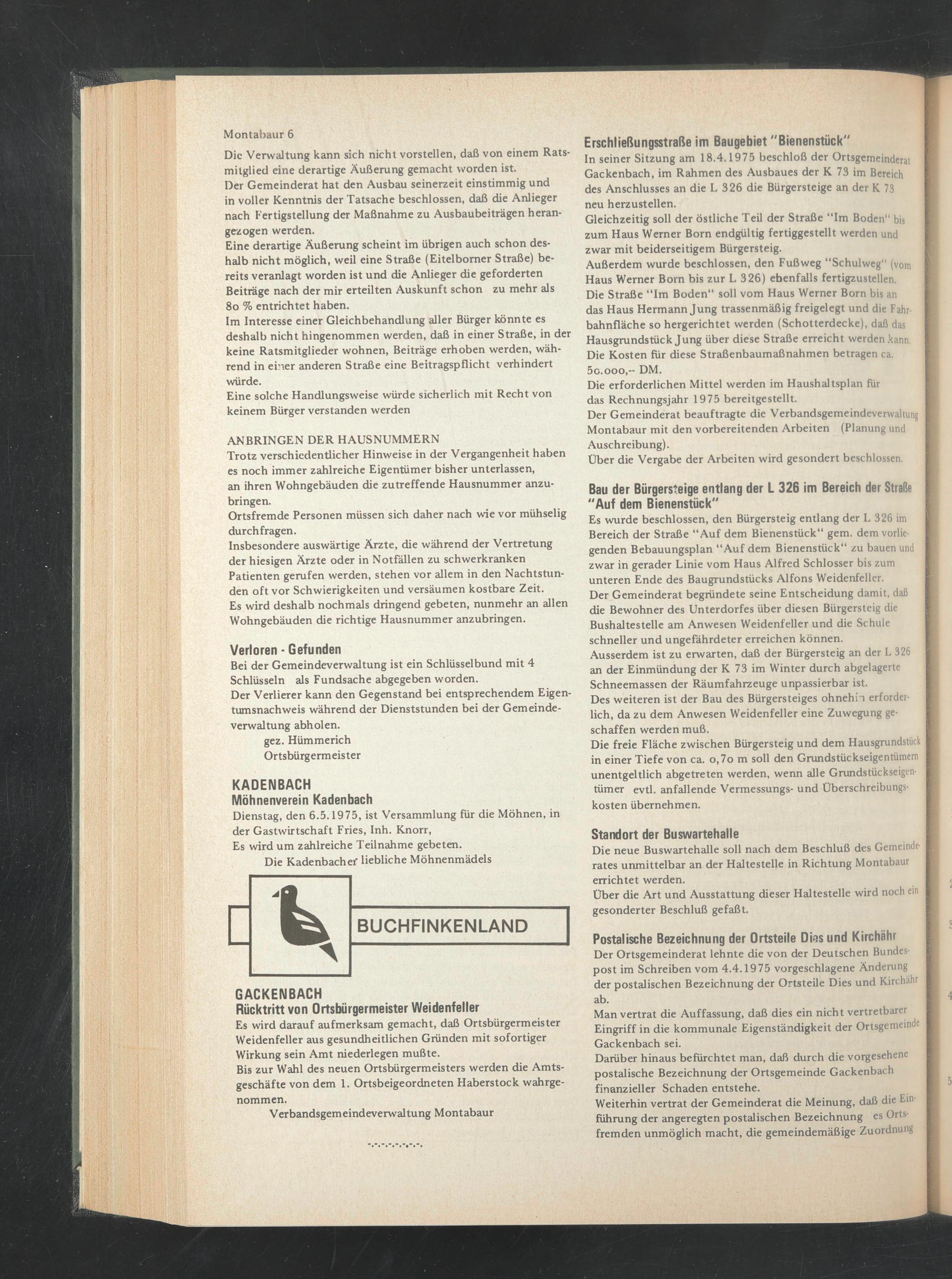 In seiner Sitzung am 18.4.1975 beschloß der Ortsgemeinderat Gackenbach, im Rahmen des Ausbaues der K 73 im Bereich des Anschlusses an die L 326 die Bürgersteige an der K 73 neu herzustellen.