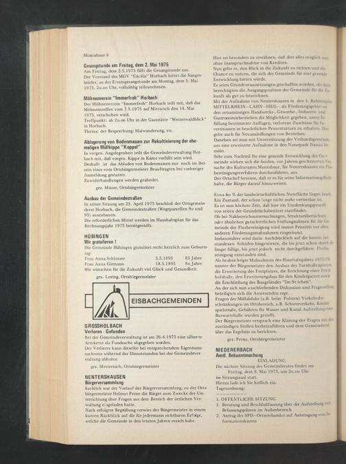 Die nächste Sitzung des Gemeinderates findet am Freitag, dem 9. Mai 1975, um 2o.oo Uhr im Sitzungssaal statt.