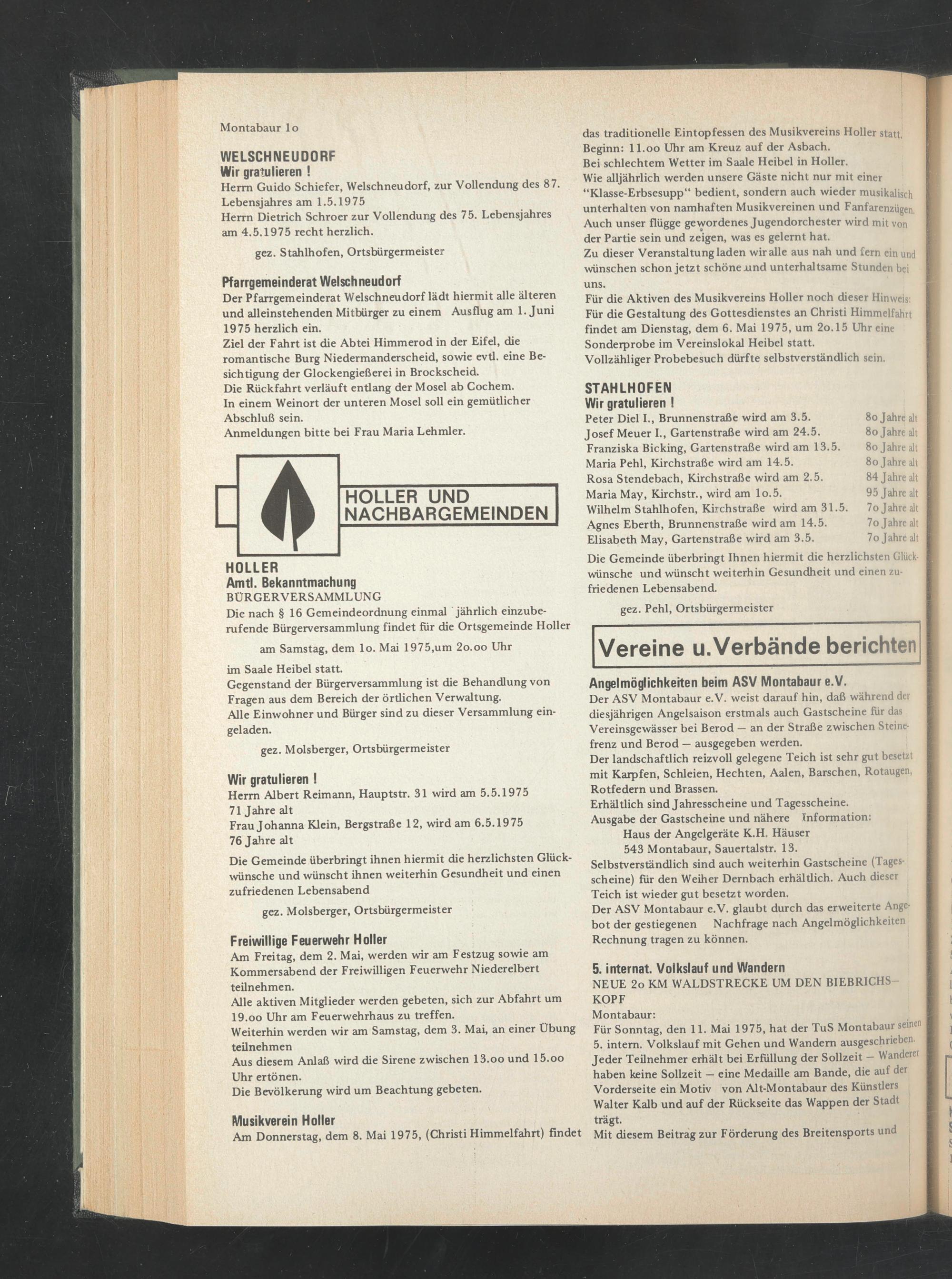 Für die Aktiven des Musikvereins Holler noch dieser Hinweis: Für die Gestaltung des Gottesdienstes an Christi Himmelfahrt findet am Dienstag, dem 6. Mai 1975, um 2o.l5 Uhr eine Sonderprobe im Vereinslokal Heibel statt.