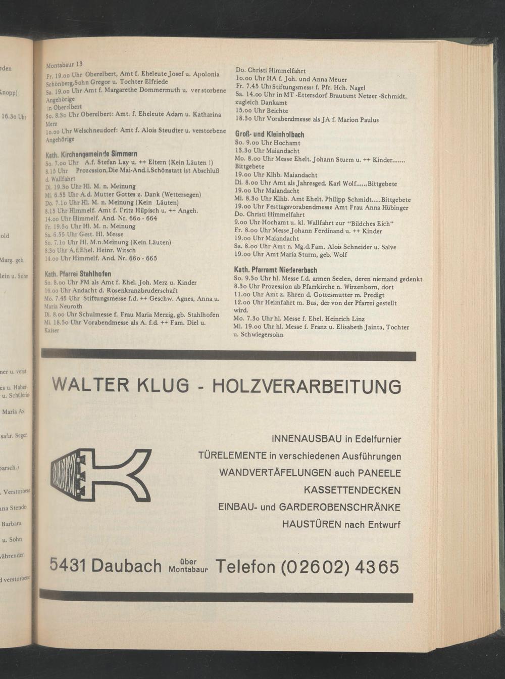 So. 8.oo Uhr FM als Amt f. Ehel. Joh. Merz u. Kinder 14.oo Uhr Andacht d. Rosenkranzbruderschaft Mo. 7.45 Uhr Stiftungsmesse f.d. ++ Geschw. Agnes, Anna u. Maria Neuroth