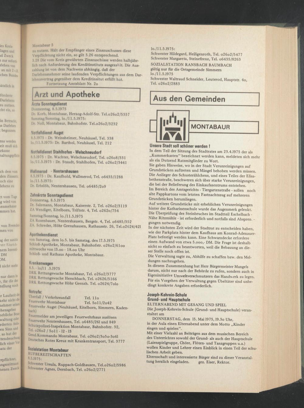 8.5.1975 : Dr. Wächter, Welschneudorf, Tel. o26o8/331 lo./l 1.5.1975 : Dr. Staudt, Stahlhofen, Tel. o26o2/3441