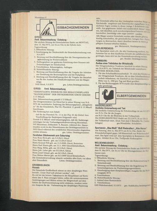 543 Montabaur, Gelbachstr. 9, Bauamt, während den Dienststunden sowie in den Diensträumen des Ortsbürgermeisters in 5431 Girod während den ortsüblichen Dienststunden eingesehen werden können. gez. Leber, Ortsbürgermeister.
