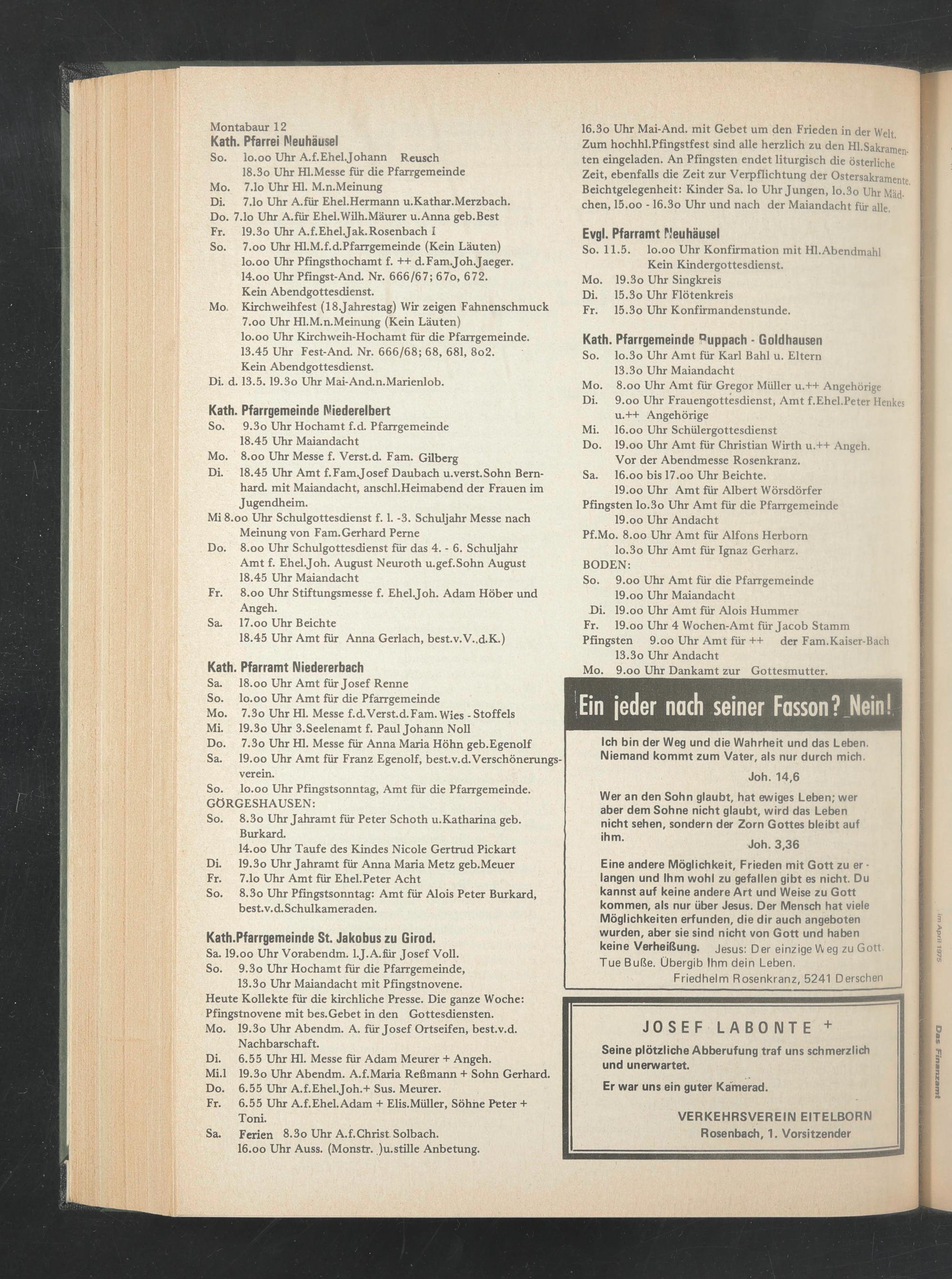 Do. 7.1o Uhr A.für Ehel.Wilh.Mäurer u.Anna geb.Best Fr. 19.3o Uhr A.f.Ehel.Jak.Rosenbach I So. 7.oo Uhr Hl.M.f.d.Pfarrgemeinde (Kein Läuten) lo.oo Uhr Pfingsthochamt f. ++ d.Fam.Joh.Jaeger.