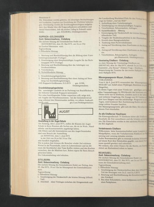 zu einer Sitzung des Vereinsrings Eitelbom am DIENSTAG, dem 2o. Mai 1975, abends 2o.oo Uhr, in der | Gaststätte „Zur Krone“ (Gisbert Vogt,) Eitelborn. Besprechung der Termine für das zweite Halbjahr 1975 1 erste Halbjahr 1976.
