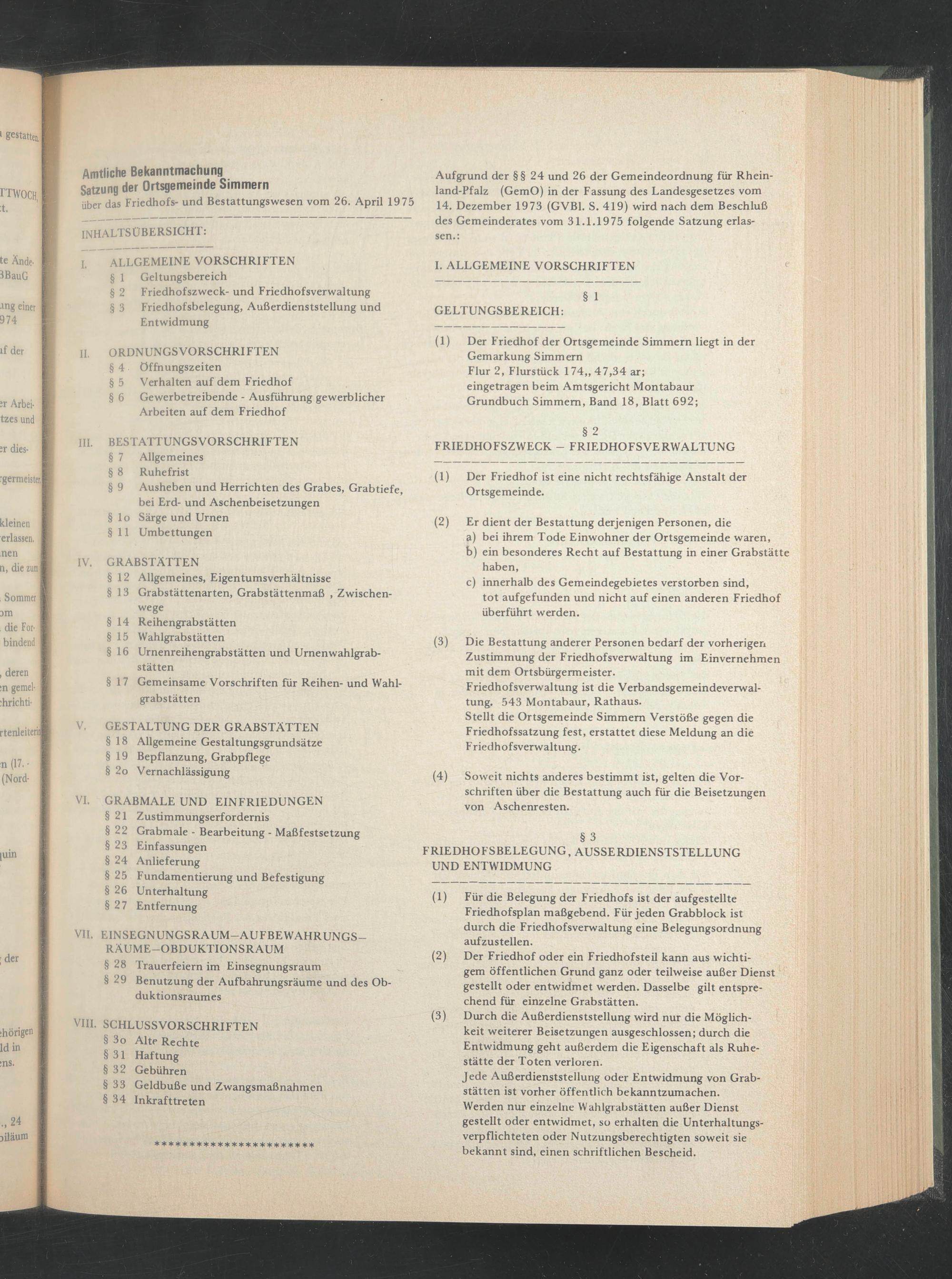 (1) Der Friedhof der Ortsgemeinde Simmern liegt in der Gemarkung Simmern Flur 2, Flurstück 174„ 47,34 ar; eingetragen beim Amtsgericht Montabaur Grundbuch Simmern, Band 18, Blatt 692;