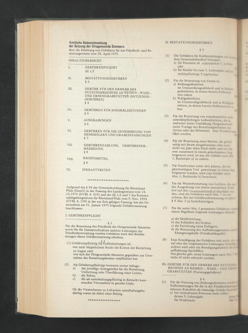 Aufgrund des § 24 der Gemeindeordnung für Rheinland- Pfalz (GemO) in der Fassung des Landesgesetzes vom 14. 12.1973 (GVBL S. 419) und der §§ 1,2 und 7 des Kommunalabgabengesetzes für Rheinland-Pfalz vom 8. Nov. 1954 (GVBL S. 139) in der zur Zeit gültigen Fassung, hat der Gemeinderat am 31. Januar 1975 folgende Gebührensatzung beschlossen: