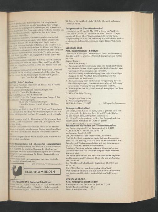 Die Eltern, deren Kinder bis zum Juli 1972 geboren sind, werden gebeten in der Zeit vom 2o. - 31. Mai 1975 die Kinder für den Besuch des Kindergartens anzumelden.
