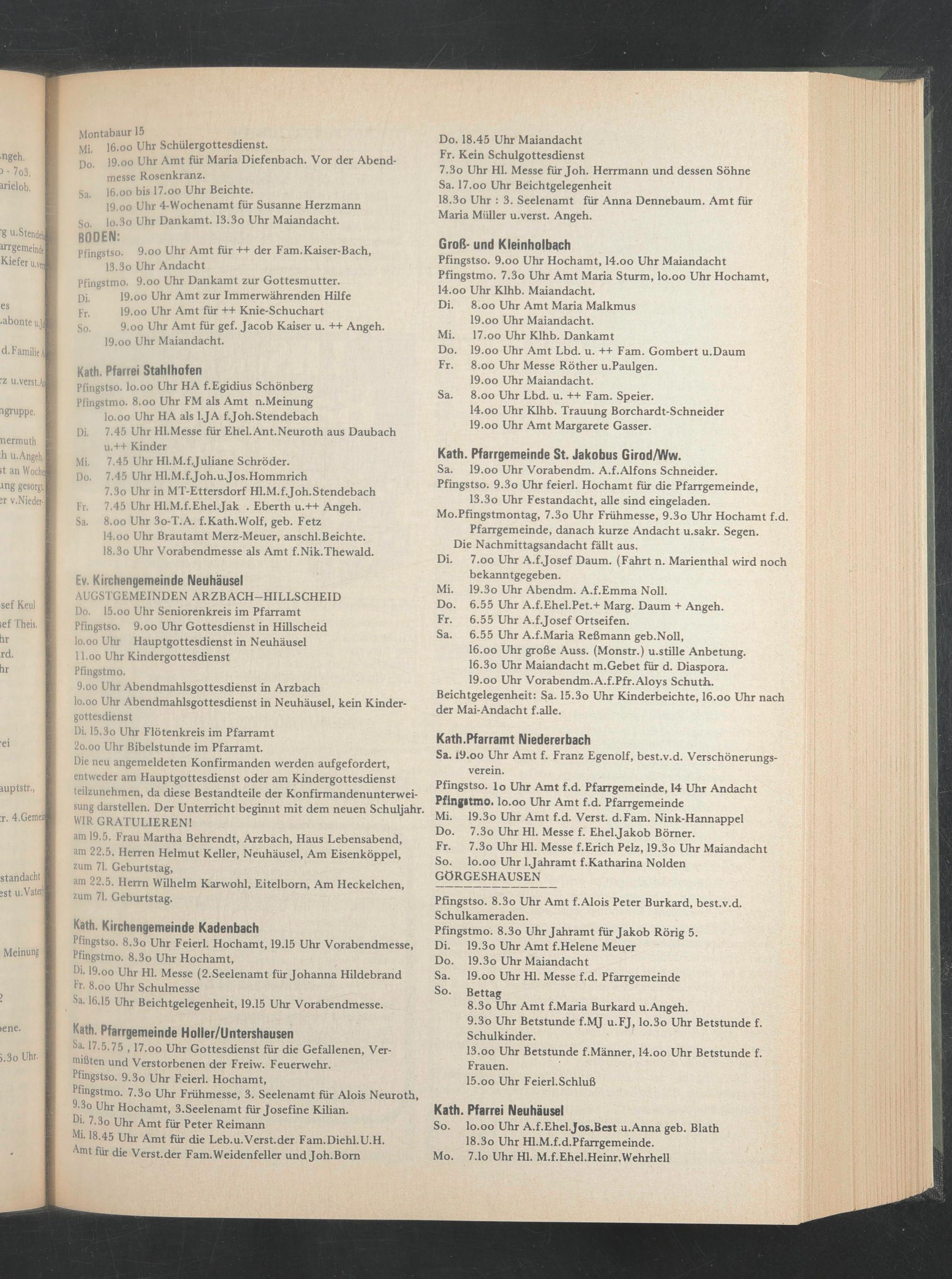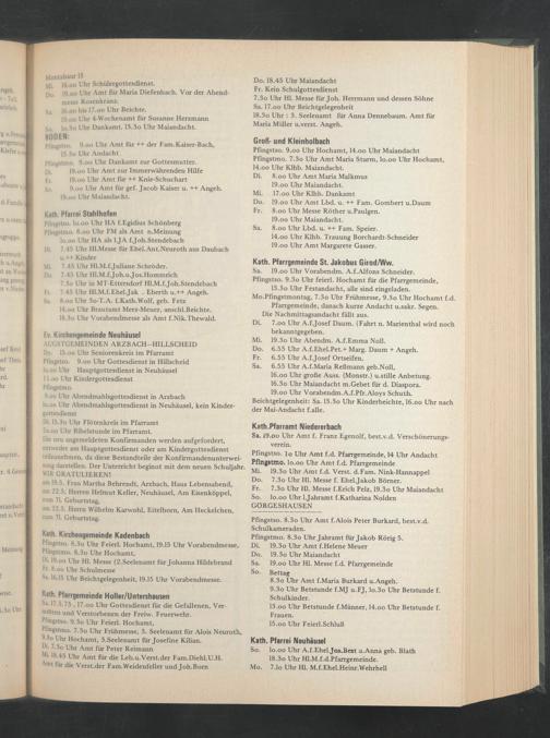 Pfingstso. lo.oo Uhr HA f.Egidius Schönberg Pfingstmo. 8 .oo Uhr FM als Amt n.Meinung lo.oo Uhr HA als l.JA f.Joh.Stendebach Di. 7.45 Uhr Hl.Messe für Ehel.Ant.Neuroth aus Daubach u.++ Kinder