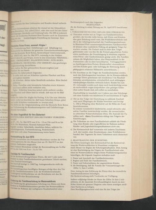 IZur Verminderung Ihrer Abfallmengen und Erhaltung von (Rohmaterial im Rahmen der gesamten Umweltschutzbemühungen, ■wird das Deutsche Rote Kreuz, Kreisverband Unterwesterwald, lam FREITAG, dem 3o. Mai 1975, erstmalig in den Städten IMONTABAUR und Wirges, sowie in den Gemeinden NIEDERELBERT, OBERELBERT, WELSCHNEUDORF, EITELBORN, [KADENBACH, NEUHÄUSEL UND SIMMERN eine genehmigte |Altglassammlung durchführen.