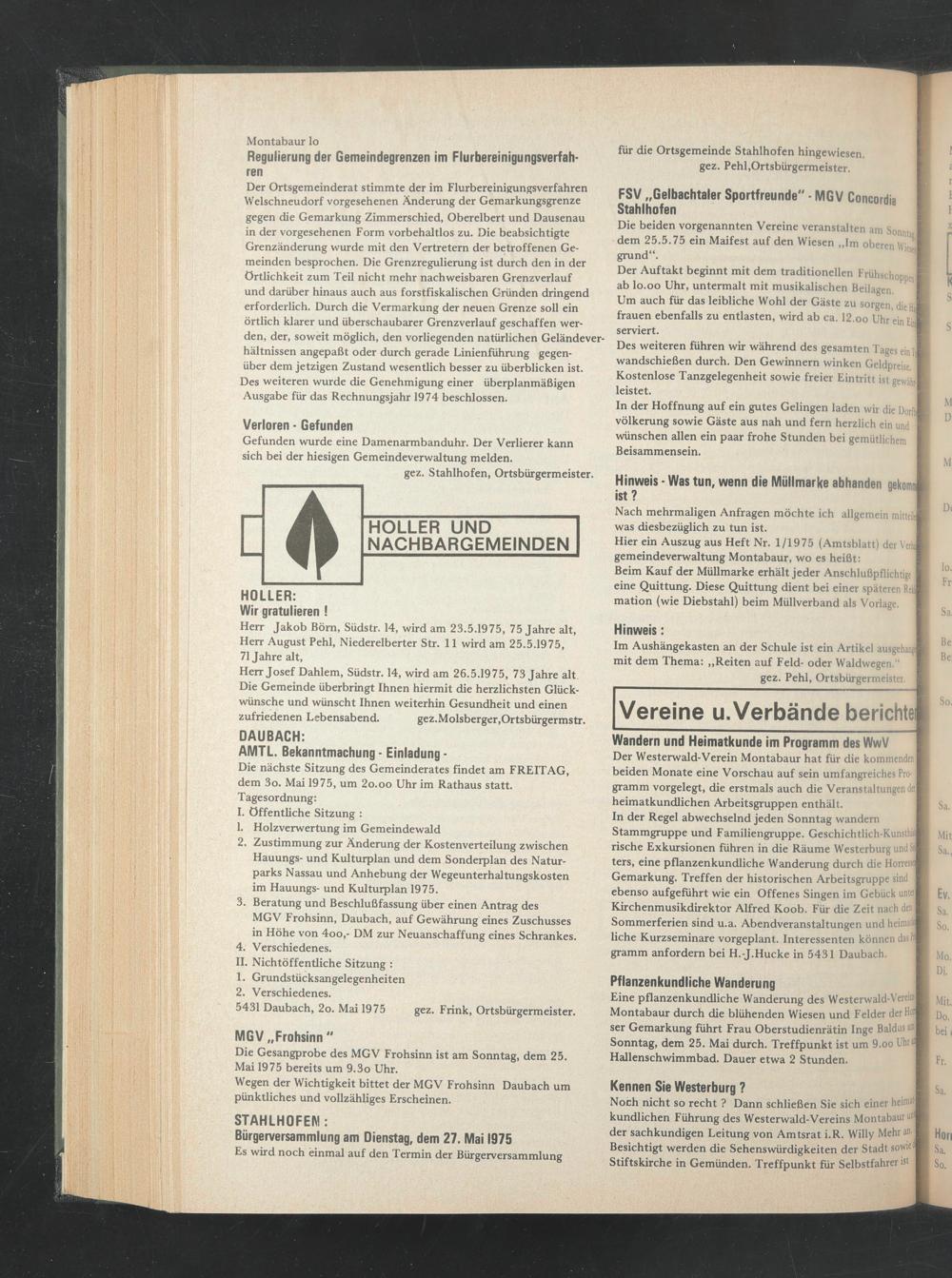 5431 Daubach, 2o. Mai 1975 gez. Frink, Ortsbürgermeister.