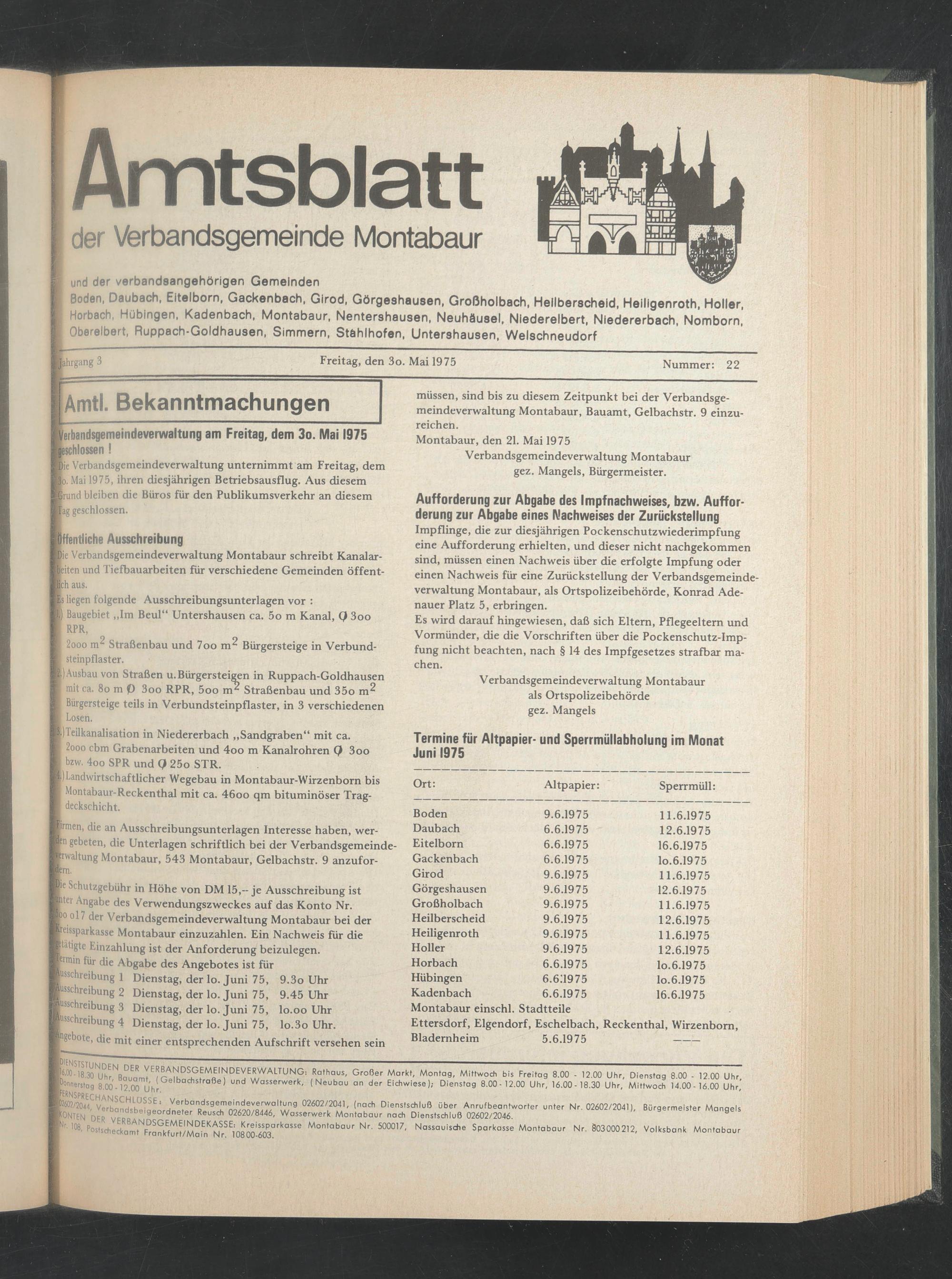 Termine für Altpapier- und Sperrmüllabholung im Monat Juni 1975