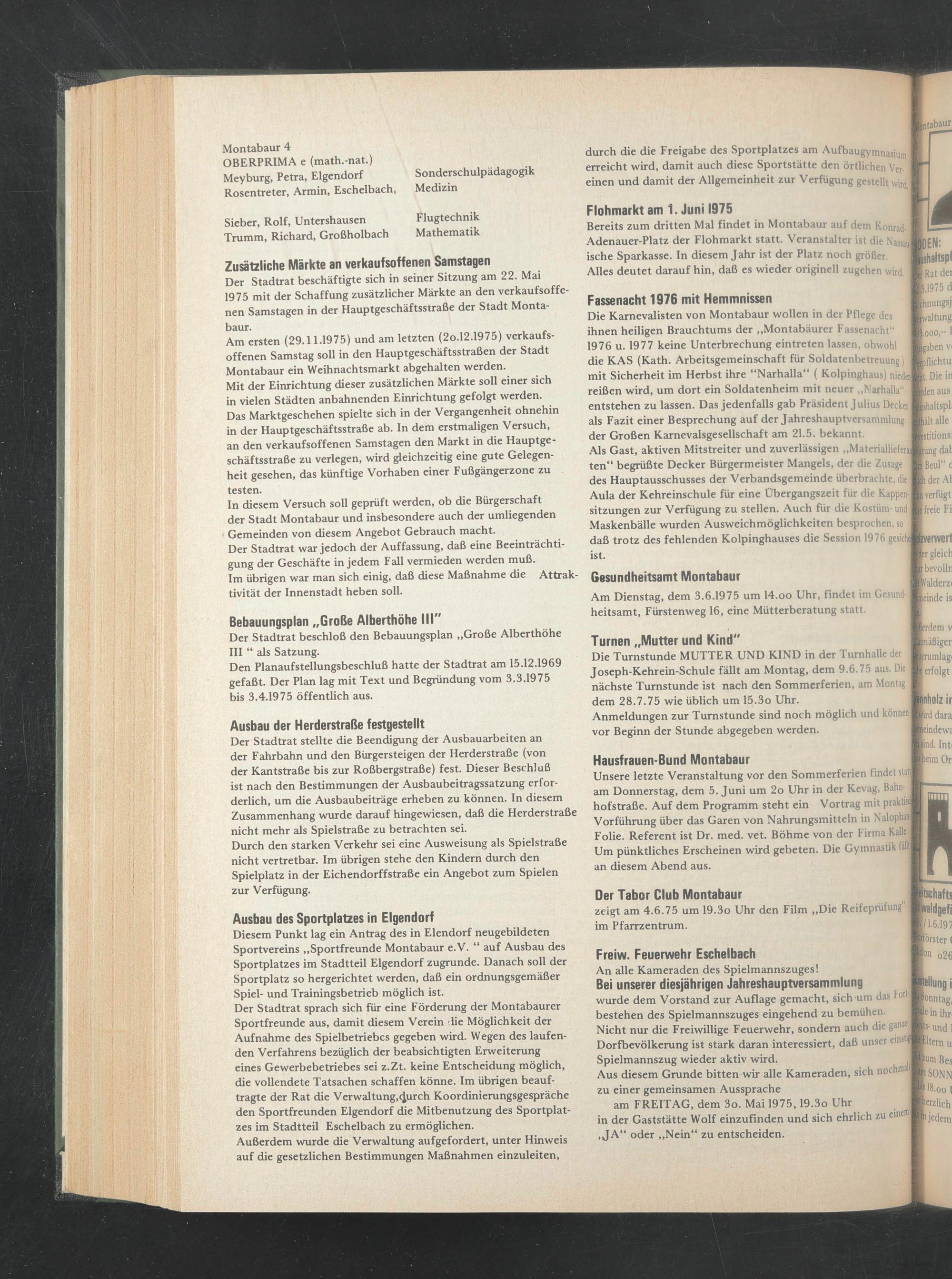 Der Stadtrat beschäftigte sich in seiner Sitzung am 22. Mai 1975 mit der Schaffung zusätzlicher Märkte an den verkaufsoffenen Samstagen in der Hauptgeschäftsstraße der Stadt Montabaur.