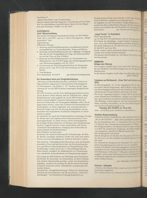 Die nächste Sitzung des Gemeinderates findet am DONNERSTAG, dem 5. Juni 1975, um 2o.oo Uhr im Sitzungsraum „Bürgermeisteramt“ statt.